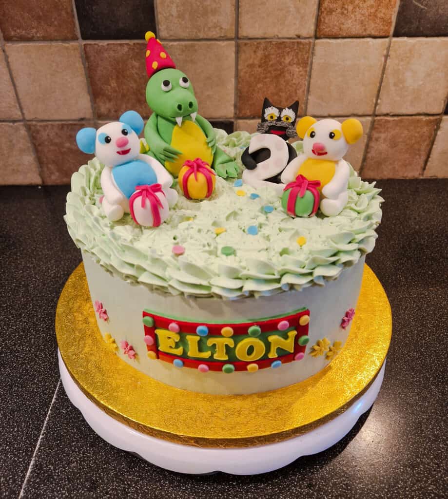 Chokladbottnar fyllda med hallonpannacotta, passionsfruktsmousse och chokladganache. Täckt med Marängsmörkräm och dekorerad med handgjorda dekorationer av sockerpasta