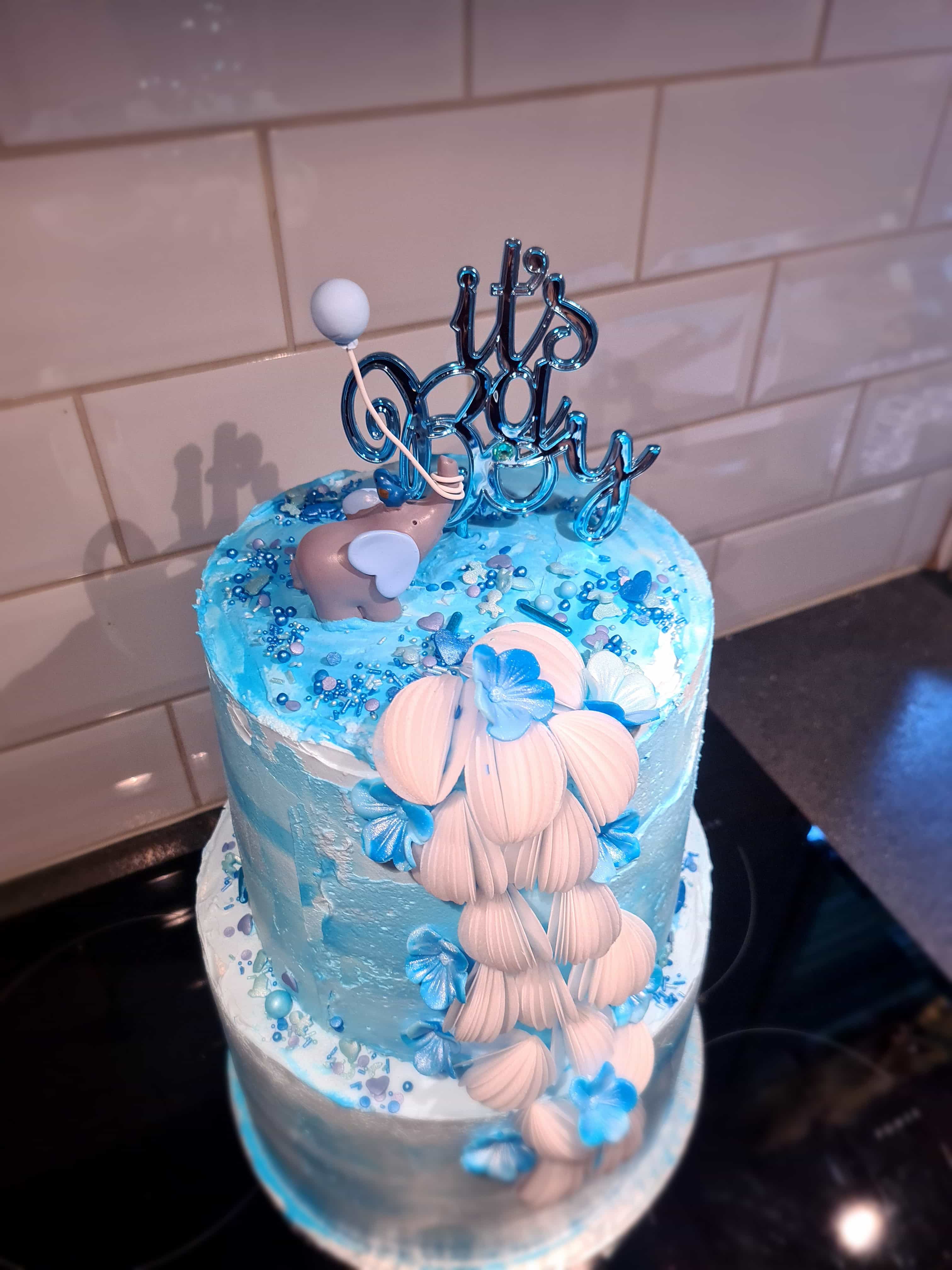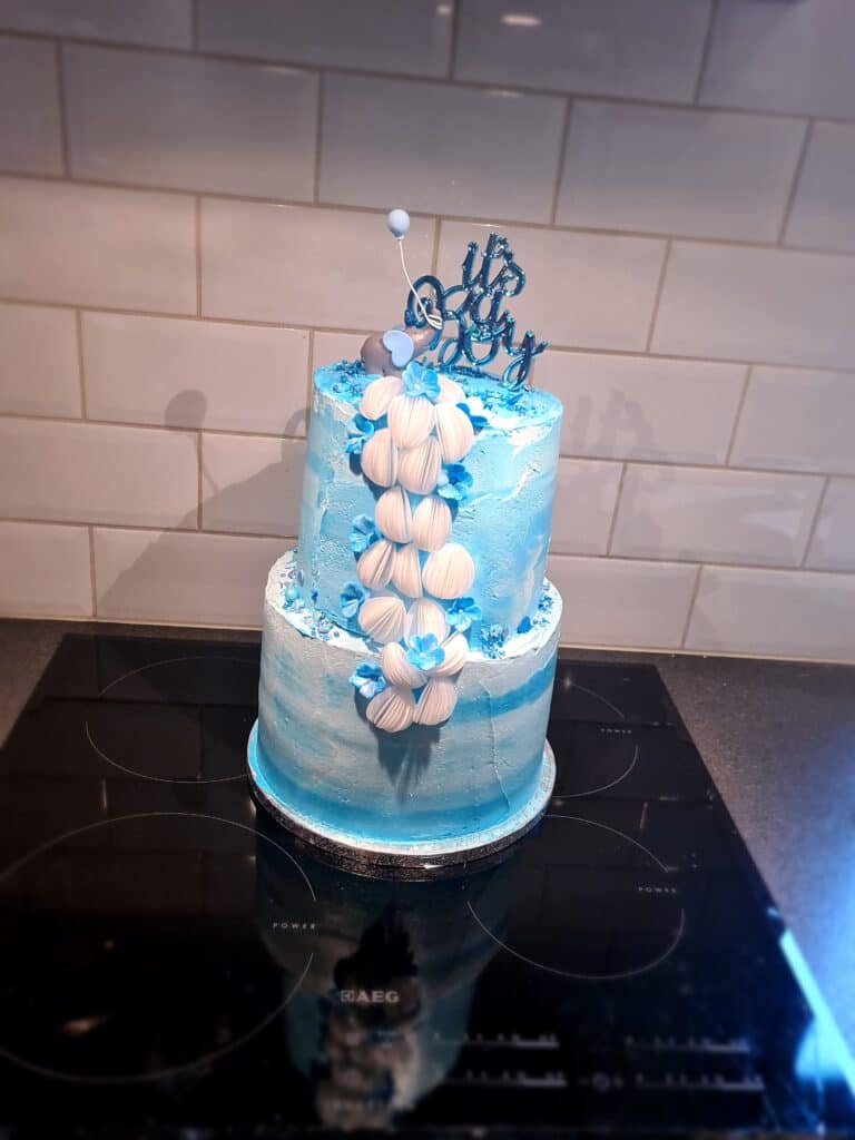 Täckt med: funcakes Enchanted Cream Frosting Mix där jag blandat i FunCakes Geléfärg Babyblå, turkos och royal blue för att få olika nyanser på frostingen.