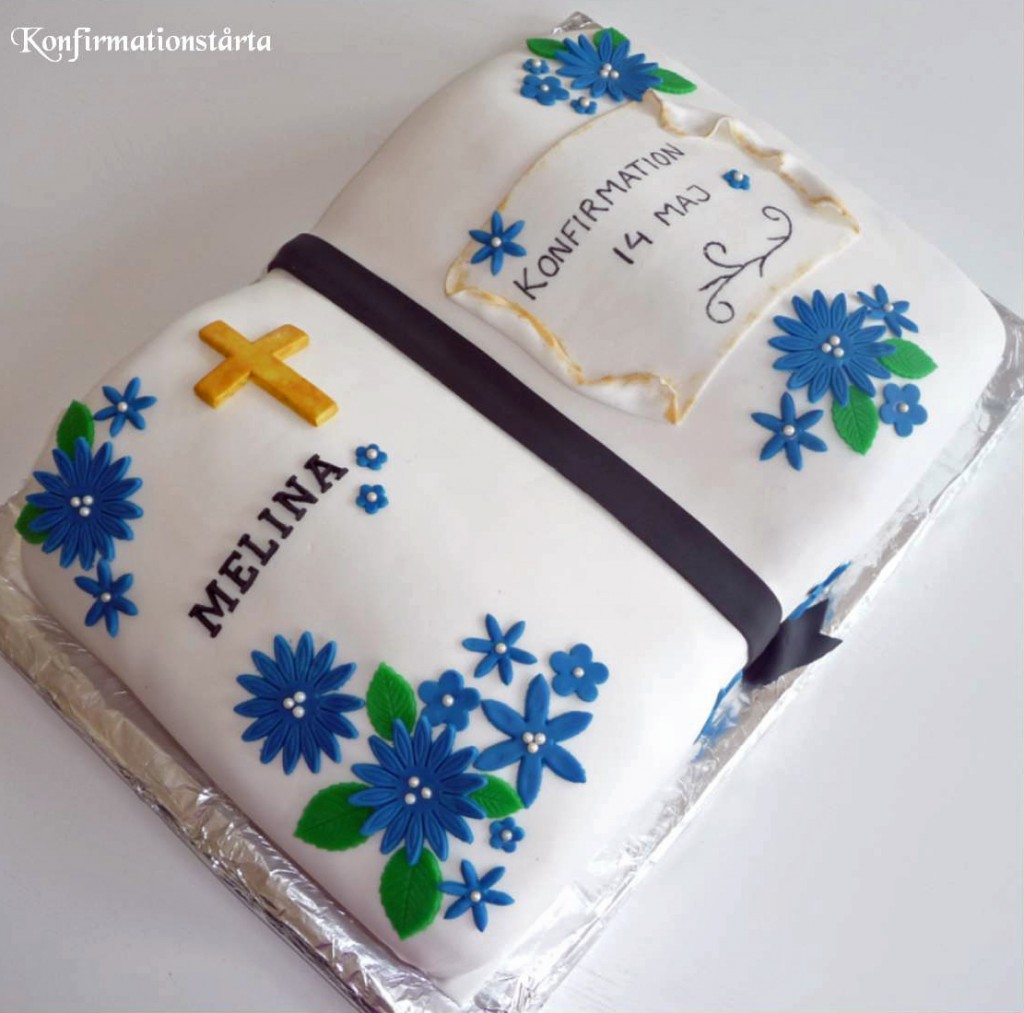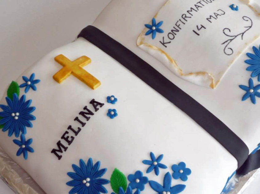 En konfirmationstårta gjord på ljusa bottnar, nutellafluff, vaniljkräm och jordgubbsgrädde. Spacklad med grädde och täckt med sugarpaste. Bokformen är uppbyggd för hand, den är inte gjord i en form.