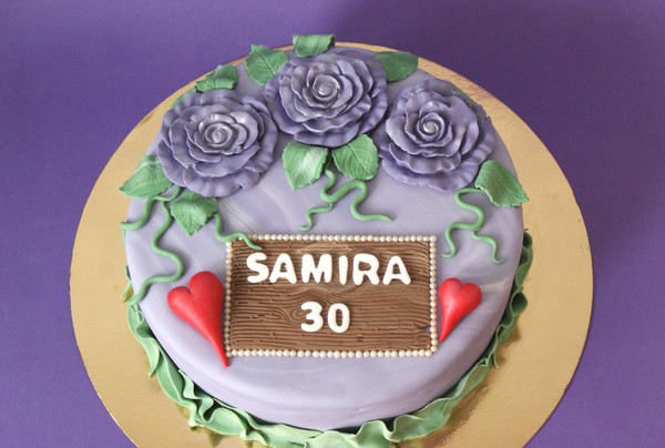 30-års tårta, melerad i lila tema. Dekorerad med stora rosor och hjärtan. Namnskylten är gjord i sockerpasta i olika nyanser av brunt som knådats samman för träeffekt.