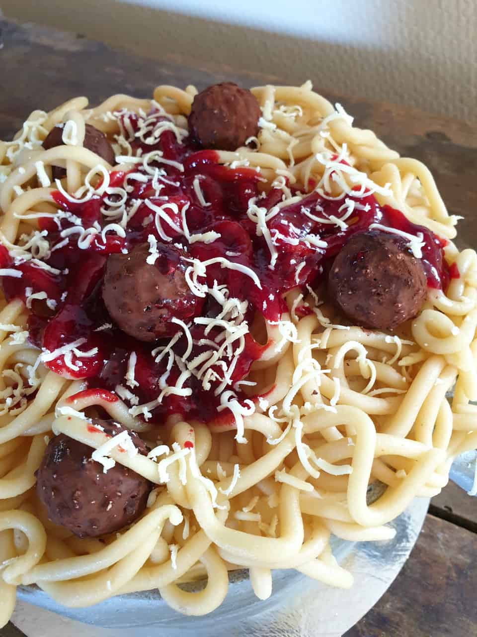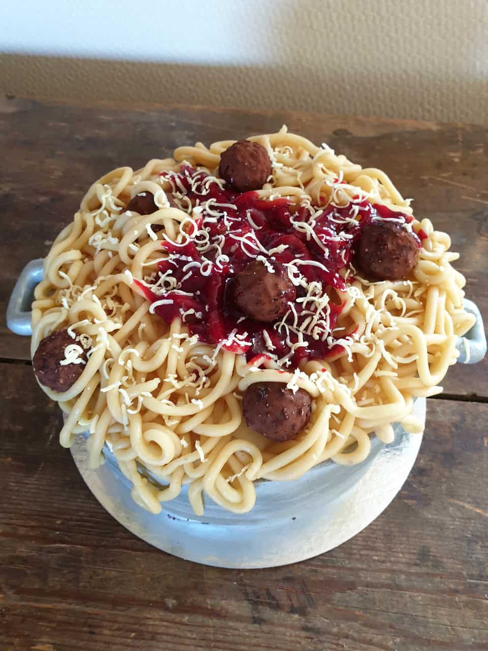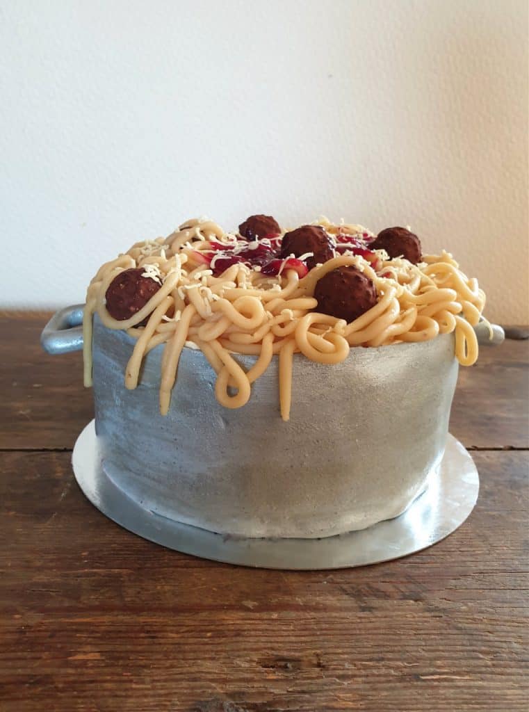 Tårtan innehåller mörka och saftiga chokladbottnar. Fyllningarna är ett lager chokladmusse och ett lager marshmallowfluff toppat med minimarshmallows. Den är täckt med marsipan som jag målat med ätbar silverfärg. Spagettin är också marsipan medan handtagen är gjorda i sugarpaste. Ketchupen är jordgubbssylt som jag färgat lite mörkare med pastafärg. Parmesanen är riven vit choklad. Köttbullarna är Ferrero Rocher som jag rullat i lite kakao.