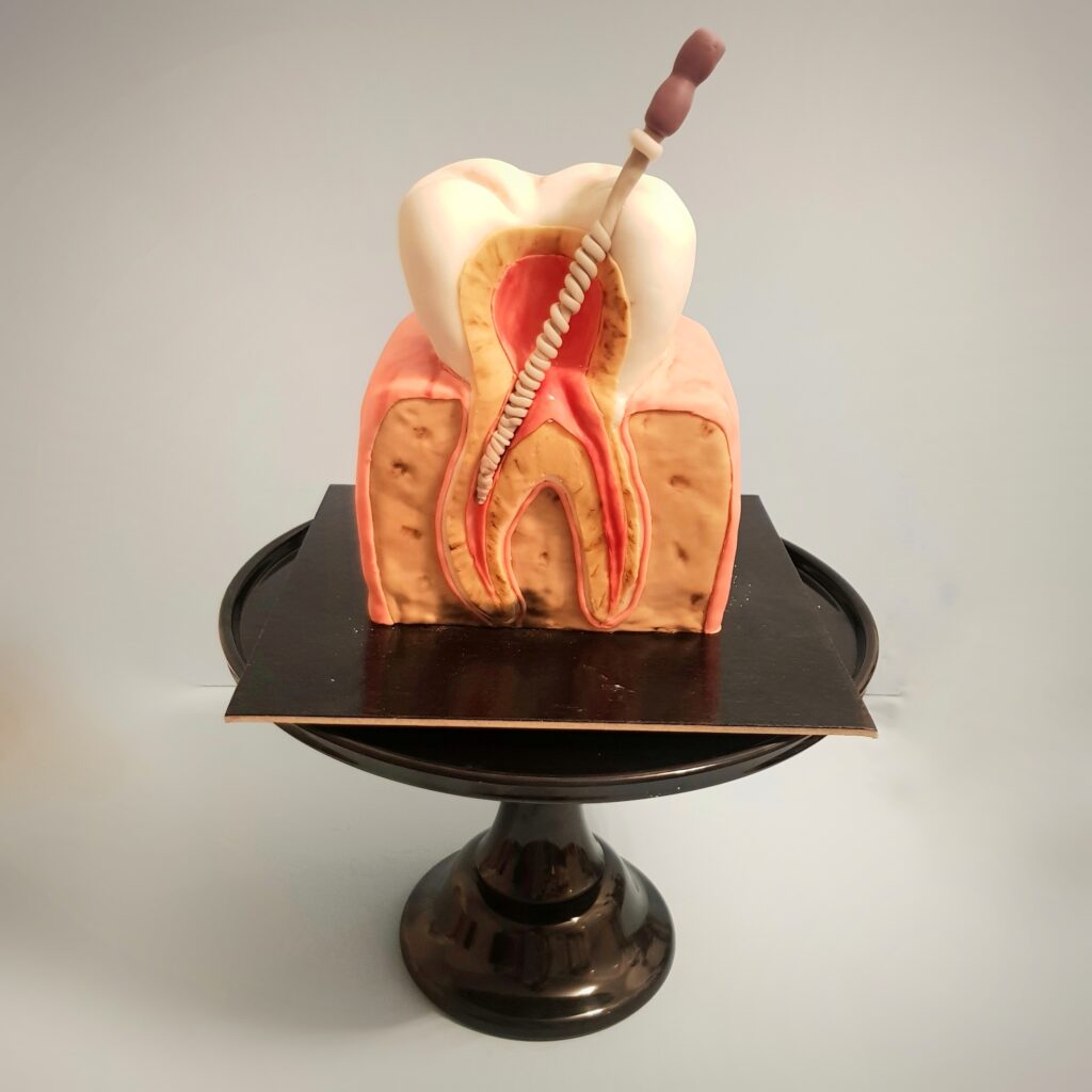 Tårtan är spacklad med len chokladsmörkräm och täckt med sockerpasta. Under tandens vänster rot ses en mörk förändring som visar tandens bakterier. Filen i tanden används för att avlägsna dessa bakterier. Varje detalj är handgjorda med färgad sockerpasta för att ge en verklighetstrogen bild av en tand under rotbehandling.