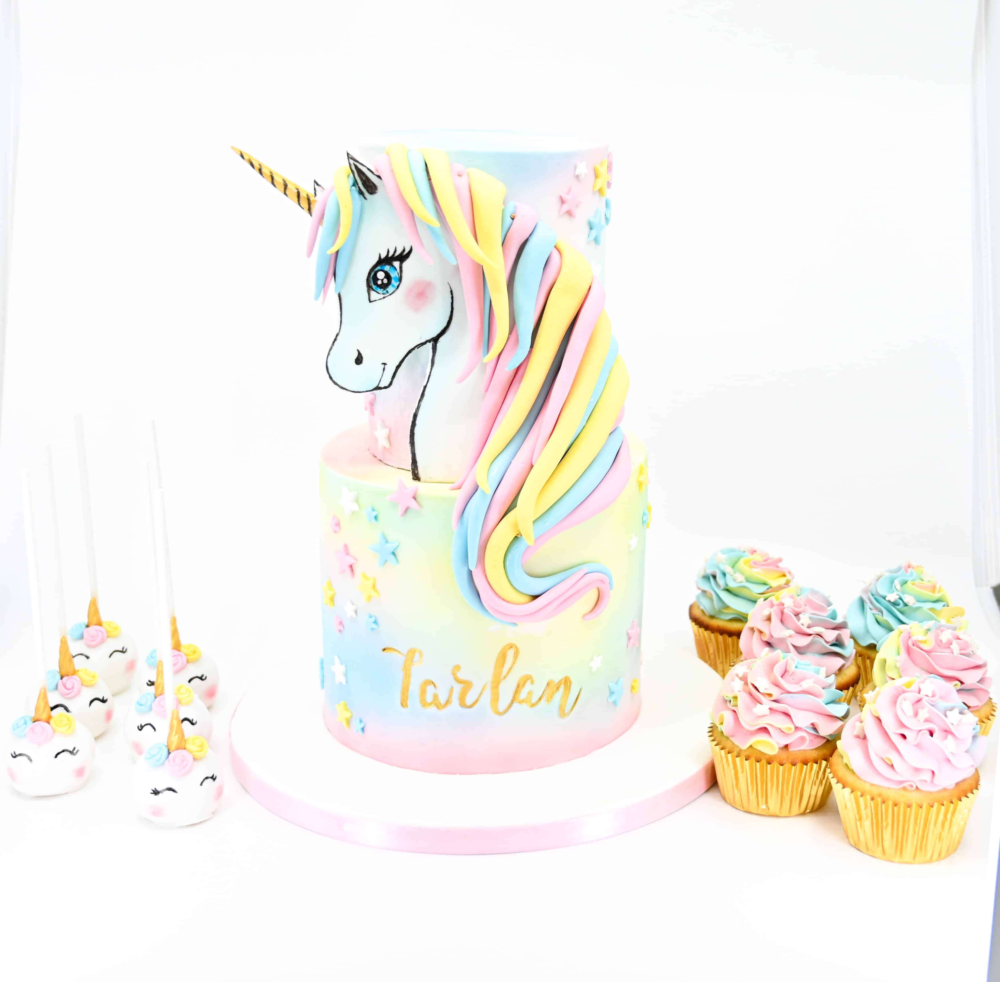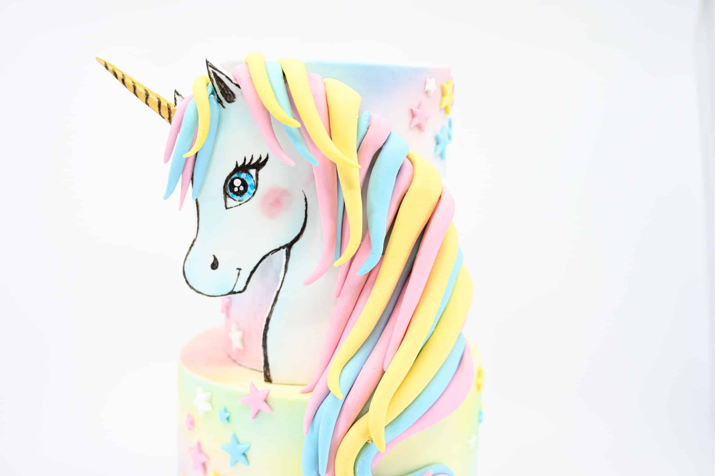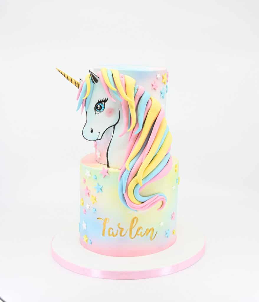 Denna tårtan har regnbåge bottnar fylld med goda fransk smörkräm! Unicornen har jag ritat och målat med hand på sockerpasta, air brushed fina ljusa pastellfärgar och fina stjärnor⭐️