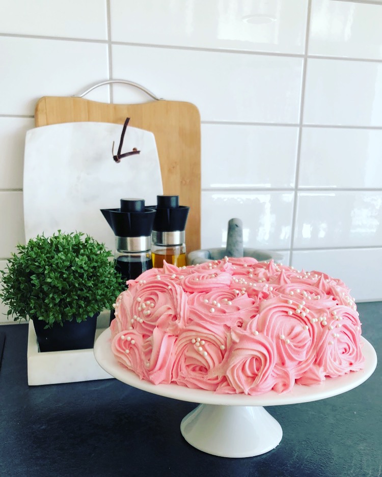 En lätt och luftig smörkräm (smör, florsocker, vanilj , röd karamellfärg och en skvätt mjölk)