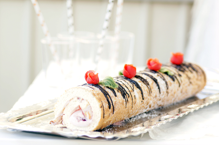 Härlig rulltårta fylld med jordgubbsgrädde och dekorerad med söta marsipanrosor.