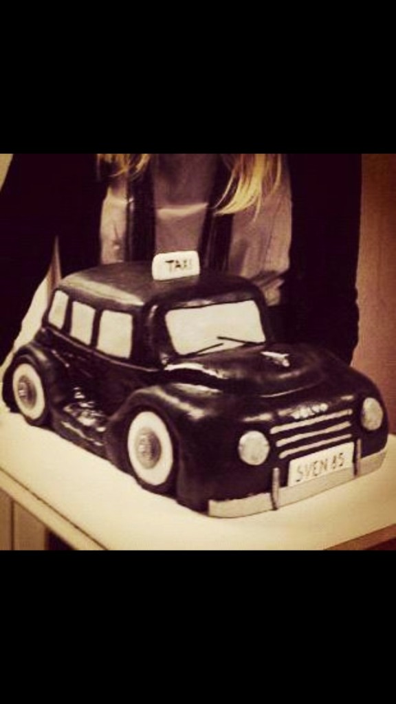 Toppad med: detaljer i sockerpasta (fälgar, reg.skyltar, vindrutetorkare, lysen mm)