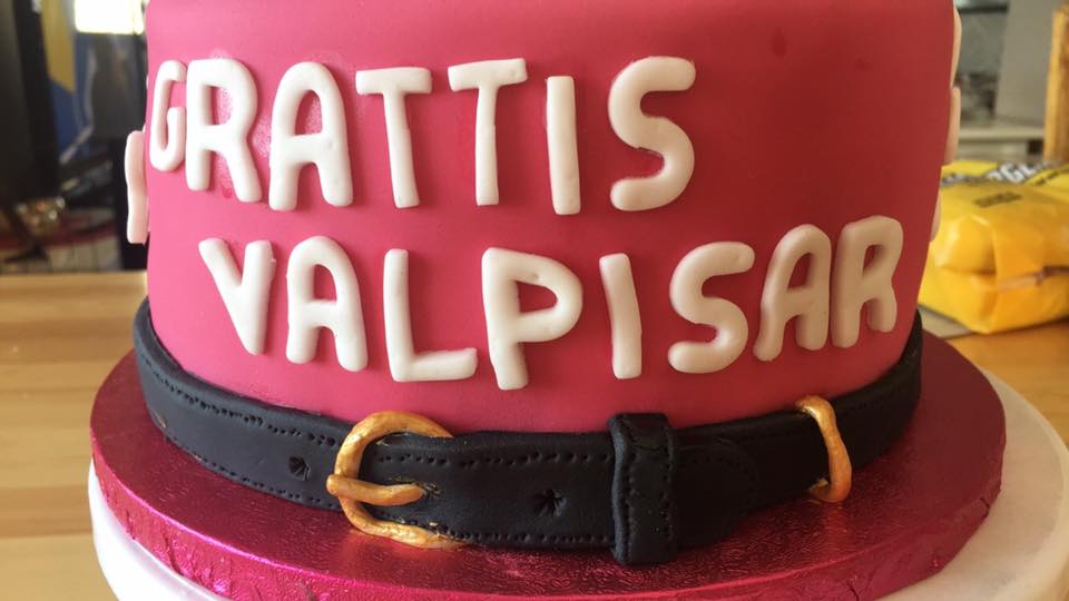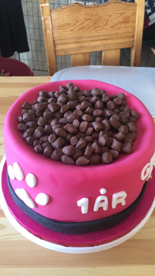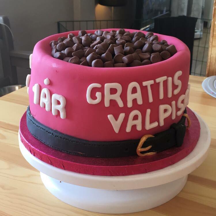 Toppad med: Sockerpasta – Bruna “torrfoder bitar”, svart hundhalsband med målade gulddetaljer runt matskålen och några vita detaljer så som tassavtryck och text
